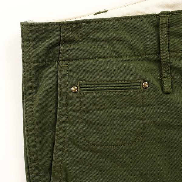 お尻のポケットのフチに入るステッチワークやベルト裏のプリントなど、細かい部分までこだわって作っているので、シンプルなチノパンながらも凄く愛着が持てるんじゃなかと思います。