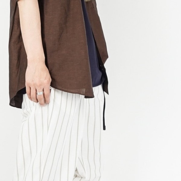 コットンとリネンを交織した涼しげな素材を使用した半袖のバンドカラーシャツ