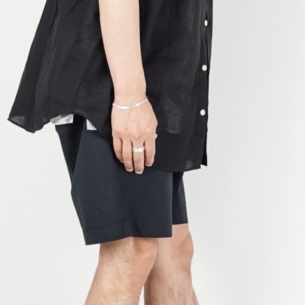 夏に上下ブラックは暑苦しい印象を与えるので、半袖のシャツに短パンを合わせる事で素肌を見せてバランスを取りました