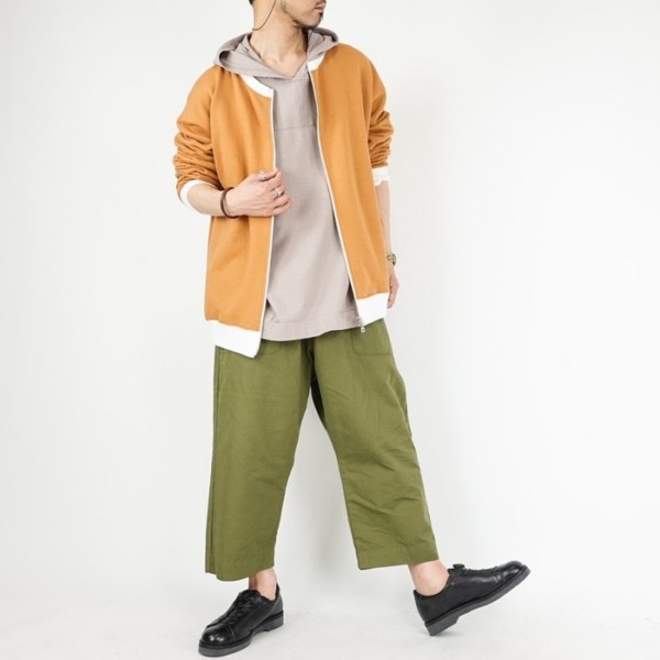 このスタイルはそのまま穿いてるんですけど、裾にゴムが入ってるのでその部分を絞るとシルエットを変える事ができるんです