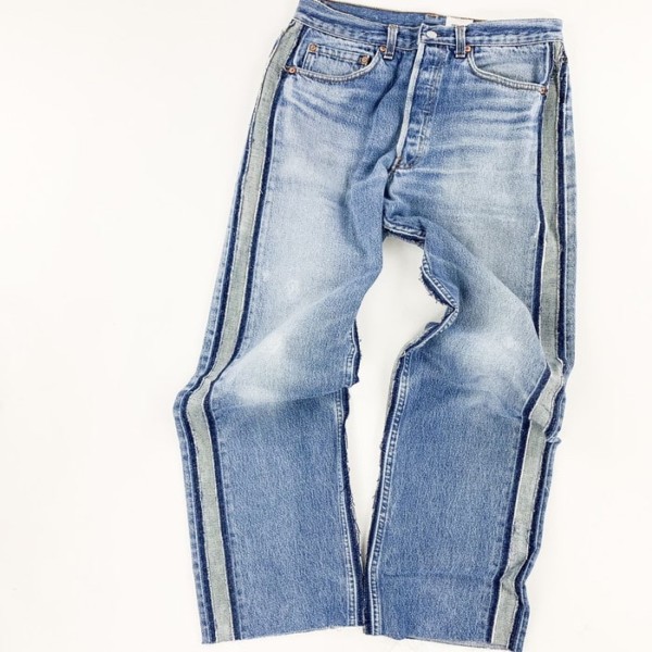 パンツの両サイドをほどいて、裏返したデニム生地を縫い付けてライン状に仕上げています。
