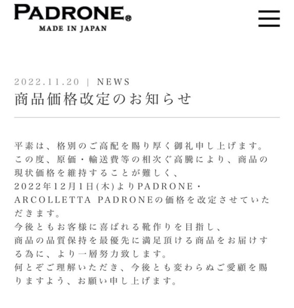 当店の人気靴ブランド「PADRONE」が値上げとなります。