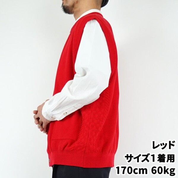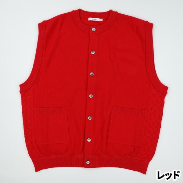 赤のベストはちょっと派手かな・・と思った皆さま、まずはスタイリング画像をご覧下さい。