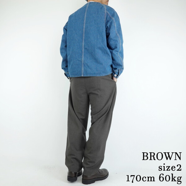 ポリエステルレーヨン生地を使用した2タックのトラウザーは、一見ワイドパンツのようなボリューム感を感じさせながらも、実際はセミワイドのシルエットで、程よい余裕と洗練されたラインを実現しています。