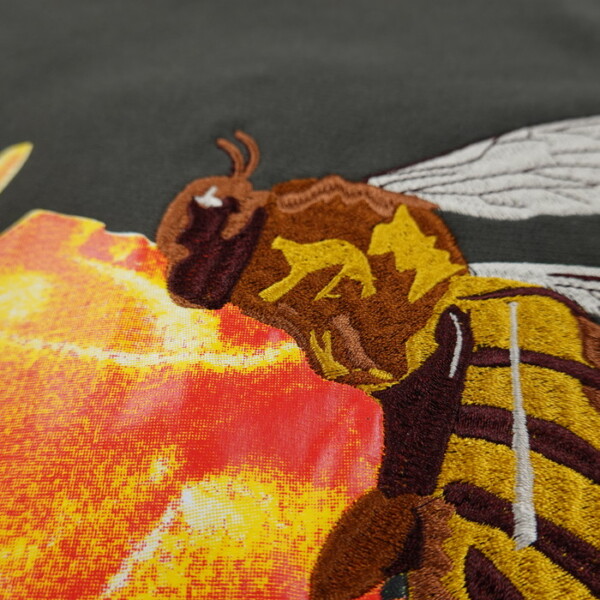 まず目に入るのは、胸元の蜂モチーフとメッセージ。