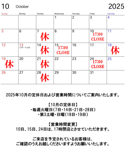 ・10日、15日、24日は、諸般の事情により 17時閉店 とさせていただきます。